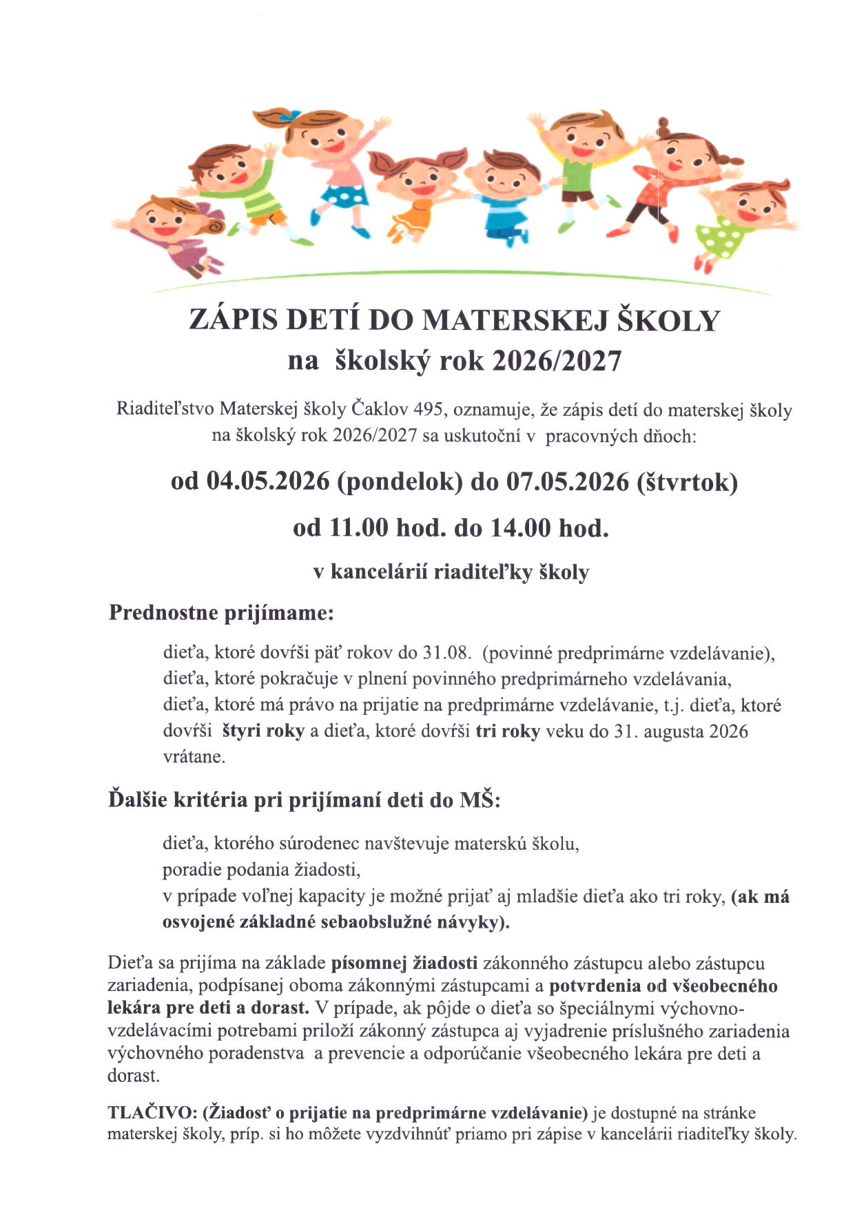Zápis detí do MŠ šk.r.2026/2027